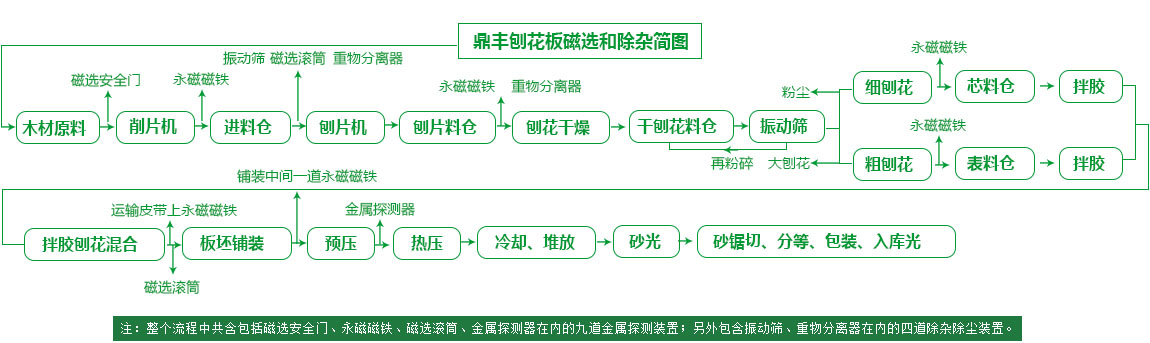 高精準氣流重物分離及篩選、超強永磁裝置無死角吸附金屬,表芯層氣流分選,全進口高精準金屬探測儀共同配合。22道全方位除鐵、除塵、除石,使成品板材純凈度得到充分保證,生產切割板材時不傷及鋸片。